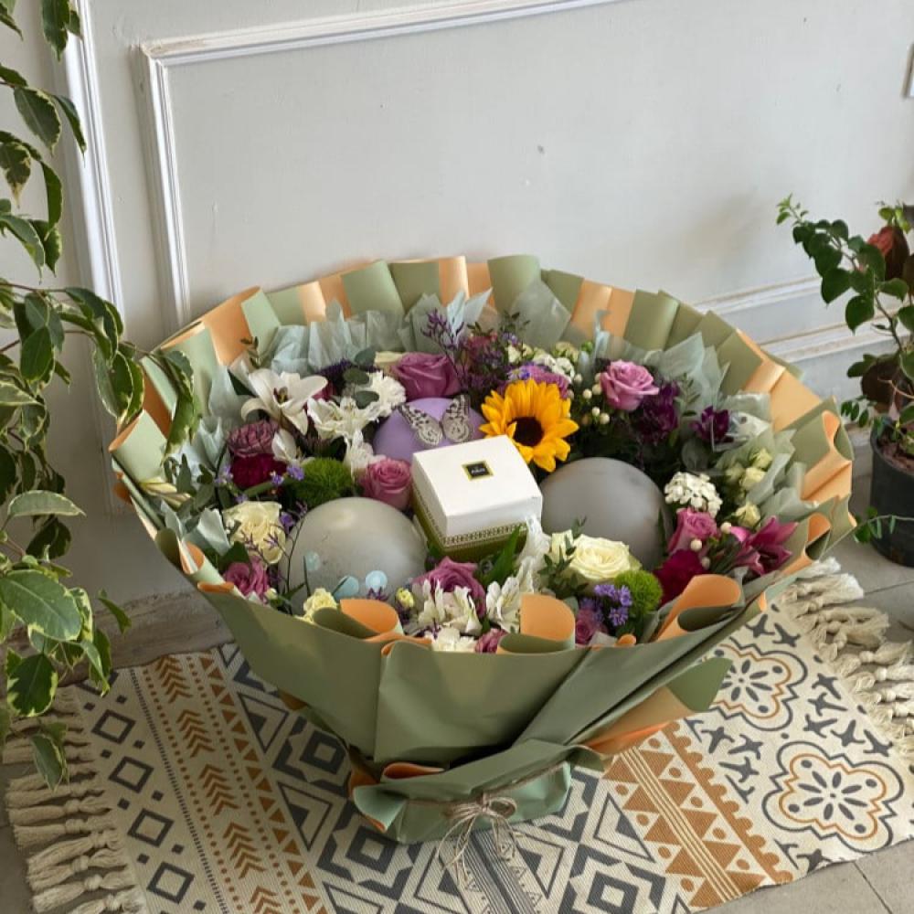 - التغليف: الباقة مغلفة بورق مصنوع من مواد ذات جودة عالية