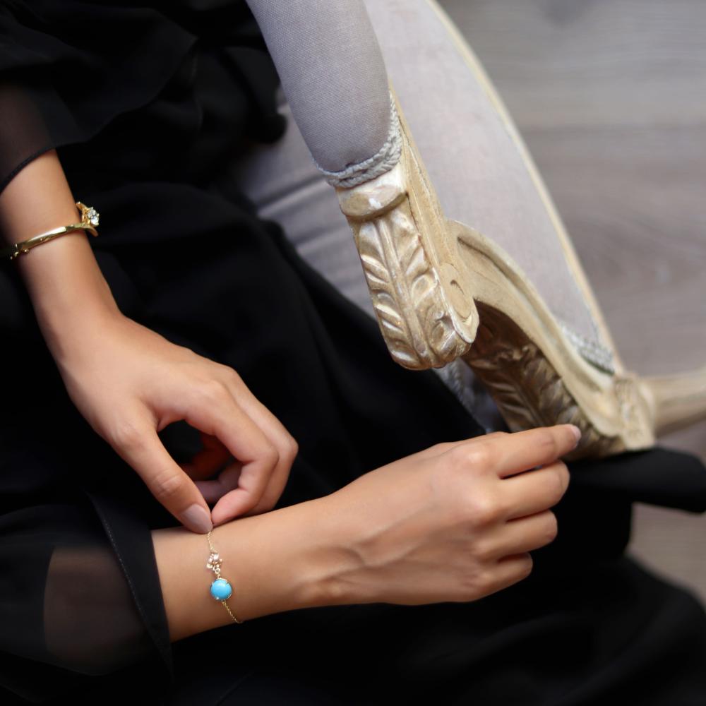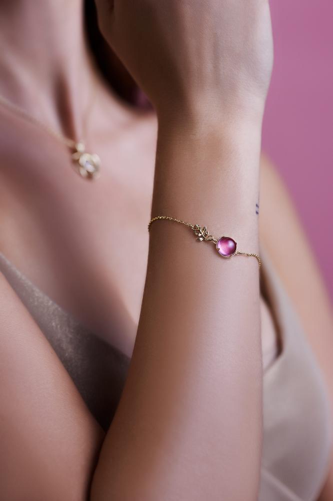 من اجمل الاساور النسائية مصنوعة من ذهب الفيرمل، ومزينة بحجر الكريستال الملون. تم استخدام زجاجات بلورية بألوان مختلفة ترضي الاذواق المتفردة، وهي مستوحاة من شكل ورقة الشجر، فترمز إلى الحياة والشغف والتجديد.